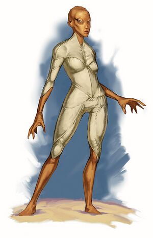 The asherati are a thin, humanoid race living beneath the sands of the Pharis Desert. They have the unique ability to "swim" through sand, ash, or other loose earth, and are even capable of breathing normally under such circumstances. They can also make their bodies glow brightly, like lanterns. Their cities are all constructed below the sands, though they are fiercely territorial and are often hostile to those who pass above.