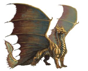 Brass dragons are a type of metallic dragon. They have large, fan-like wings and a bony plate extended out from their upper skull.