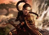 Chizu was a human samurai from Yung Shai who traveled with her good friend, Krom. While in the port town of Stark, they met up with a small band of adventurers and headed up to the town of Duvik to investigate a mysterious plague that had come upon the town. Together, they uncovered and slew the orcish cleric who had created the plague. Unbeknownst to them, in doing so they incurred the wrath of another cleric of Gruumsh, who summoned the Mortal Hunter to kill them in revenge.