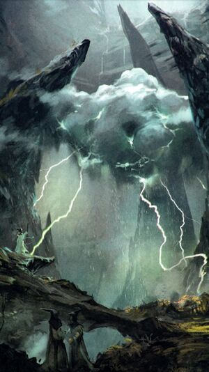 When they reached the top of the palace spire, they found Lanak Iskarr with the spear Windvane, attempting to summon Yan-C-Bin. When they disrupted the summoning ritual, he instead channeled the archomental's power into himself and became an aspect of the Howling Hatred. During the battle that followed, Drake killed Stormdancer and Honeysuckle delivered the killing blow to the Storm King, who exploded in a burst of lightning. Unwilling to risk the spear falling into the wrong hands again, Sumac cast a spell to fly them down to Jib's ship, and then sailed them on magical winds across the Dragon Sea, through the cave mouth leading down into the ruins of Belsimar, and into the windswept caverns below. There, Sumac plunged the spear into the stormy gateway to the Plane of Air, closing the portal with a mighty thunderclap and causing Windvane to rust away into dust.