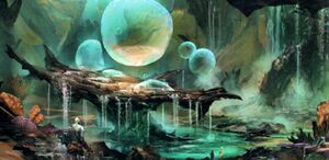 Drake's Company, meanwhile, descended back down the waterfall in search of the leader of the Cult of the Crushing Wave. Ignoring the watery globe, they took the boat and rowed into the eastern caverns. There they found a dozen cultists, but after killing several of them the remainder surrendered. When questioned, they told the heroes that their prophet, Gar Shatterkeel, could be found in the lake to the south. They also explained that the watery globe was a means of transport; it would float to the lake if someone climbed into it. As the path to the south was lined with rapids, they instead used the bubbles. After cresting the final waterfall, they found themselves overlooking a massive underground lake. At the center of the lake was a rocky island, and above it floated a massive watery sphere. Gar Shatterkeel stood before the sphere, a trident raised high in the air.