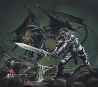 Eilorixx was a black dragon living in the Dragon Lands. When followers of the dracolich Sinianth located their master's phylactery, Eilorixx became incredibly paranoid that they intended to use his body to resurrect Sinianth. He used a good portion of his hoard to pay other chromatic dragons for a variety of traps, spells, and artifacts to protect his lair from both divination and intrusion, and spend most of his days utterly terrified that Sinianth's minions would come to kill him. In the end, however, it was not the minions of Sinianth but the Brightstone Heroes who entered his lair, seeking information about the disappearance of the body of an aspect of Bahamut. Believing the heroes to be the very people he feared were coming for him, he attacked them and, when it became clear he would not survive the encounter, bit a staff of power in half, vaporizing himself in the ensuing explosion.