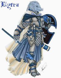 Elytra is a dragonborn battlemind/warden and a follower of Nalindra. Her scales are a silvery-blue color, and she looks somewhat different, more bear-like, than the average dragonborn.