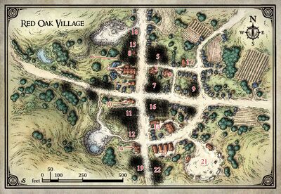 Red Oak Village is a small village in the central part of Orodeth. Named for the small grove of oak trees that were cut down to make room for the village, it has prospered due to its location on the road since its founding in 2738. Though a significant portion of the village burned down in 2964 during an attack by the Cult of the Eternal Flame, the villagers were determined to rebuild. Sadly, they would never get the chance. The following year, the emergence of Olhydra and Ogrémoch into the world resulted in the Shattering of Orodeth. Red Oak Village was utterly destroyed in the cataclysm, and all of its residents were killed.