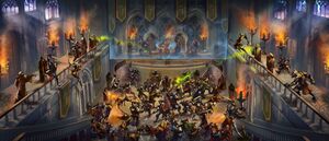 Beyond the throne room they came across a long hall with two murals: one showing a ragtag army battling chromatic dragons, and one showing Master Arlen and King Tarn Hargrave standing outside the newly-built royal palace. Past the hall of history was the hall of monarchs, featuring statues of the late King Waldrann, Dowager Queen Lyrencia, and Queen Aphinah. The king's statue had been toppled over, and the Third Eye took the opportunity to deface the other two. The next room they checked was the hall of trophies, where the heads of great beasts (including a dire bear and a red dragon) were mounted. Three absolutely terrified servants were busy dusting them, but they happily told the group what they knew of the queen: one of them had seen a carriage from the Gorso family by the stable, and suspected she was entertaining them in the meeting rooms in the west wing, across the garden. They then decided they were done dusting and practically bolted out of the room. The group consulted their map and decided to take the most direct path there. This led them into the reception hall, which was dominated by a massive painting depicting the attack on the palace by the blue dragon Malzdreziret several decades ago, and occupied by half a dozen clearly inebriated royal guards. The guards tried to stop them, but when that proved beyond their ability in their drunken state, one of them staggered into the ballroom next door and called for the queen.